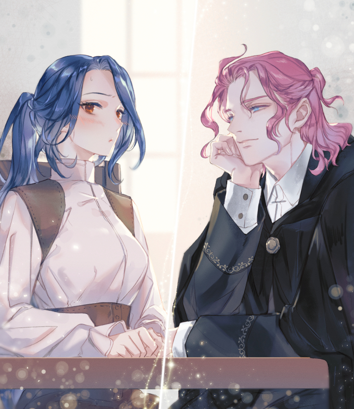 شعر وردي داكن مربوط لأعلى، عينان زرقاوان كسماء الصيف، وبشرة ناصعة كالمرمر.